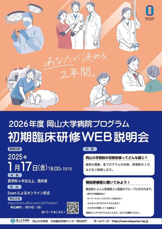 国立大学法人岡山大学(本部:岡山市北区、学長:那須保友)の岡山大学病院では、「2026年度岡山大学病院プログラム 初期臨床研修WEB説明会」を、2025年1月17日(金)18:00~19:15に開催いたします。