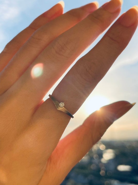 夕陽を見つめるジュエリーサンセットリングは夕陽が水平線に落ちていく様をかたどったHAVITASオリジナルのデザイン。