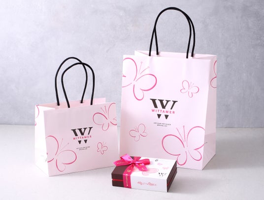 1月10日(金)から2月14日(金)の期間中、ヴィタメールのチョコレート商品またはバレンタイン限定ギフトをお買い求め いただいたお客様には、オリジナルデザインの限定ショッパーでお渡しいたします。薄いピンクのベースに蝶が舞う可愛らしいデザインで、普段のシンプルなショッパーとは一味違う特別感を演出します。この機会にぜひご利用ください。