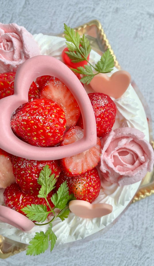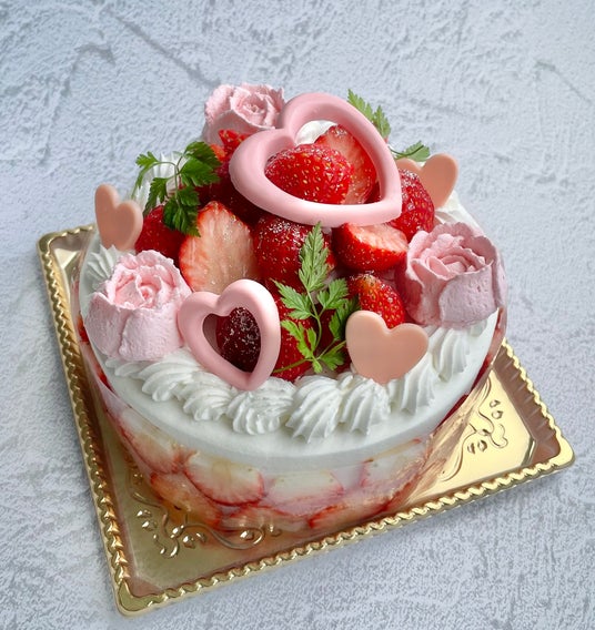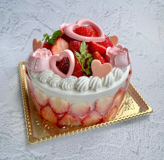 旬を迎えたばかりの甘くみずみずしい真っ赤な苺やピンクのバラの生クリーム、チョコレートで作ったハート飾りを散りばめた「カワイイ」がぎゅっと詰まったスペシャルなケーキです。