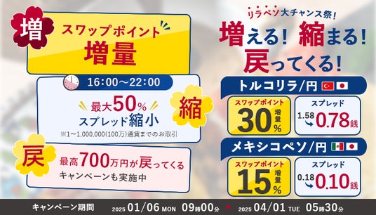 キャンペーン期間中にトルコリラ/円(TRY/JPY)・メキシコペソ/円(MXN/JPY)において新規建てしたポジションを対象に、受取スワップポイントに上乗せして、下表の通りキャッシュバックいたします。増額率は、メキシコペソ/円は15%、トルコリラ/円は30%となります。 さらに、16:00~22:00の時間帯における1~1,000,000(100万)通貨までのお取引のスプレッドを縮小いたします。また、トルコリラ/円(TRY/JPY)・メキシコペソ/円(MXN/JPY)は、同時開催の「最高700万!預かり資産に応じて最大15%上乗せキャッシュバック!」の対象通貨ペアとなります。
