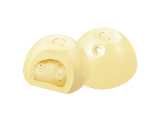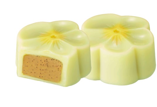 味わい深いバニラアーモンドプラリネを、花形の淡い黄色のホワイトチョコレートシェルで包みました。まろやかな優しい美味しさが味わえます。