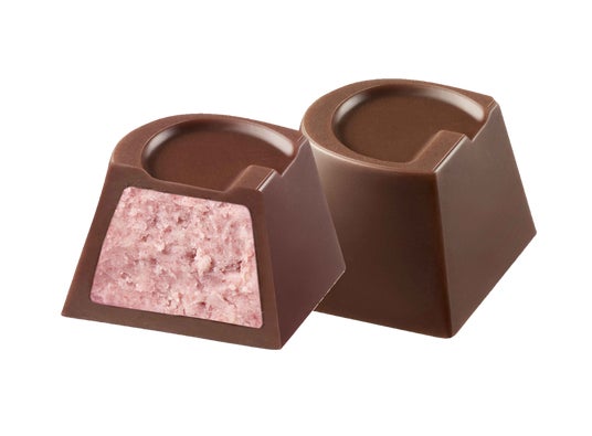サクサクとしたクランブルが入ったホワイトチョコレートのストロベリームースを、ミルクチョコレートでコーティングしました。