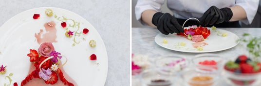 「恋する乙女」がテーマのシグネチャープレートには、しっかりとした甘みと穏やかな酸味が特長の「恋みのり」を選びました。「恋みのり」の大輪のバラが咲きほころび、一折ごとに思いを込めたバラ色のオートクチュールドレスを纏う一皿に仕立てました。中央にはリング状のチョコレートで指輪を表現し、どこから見ても華やかになるよう細部までこだわります。