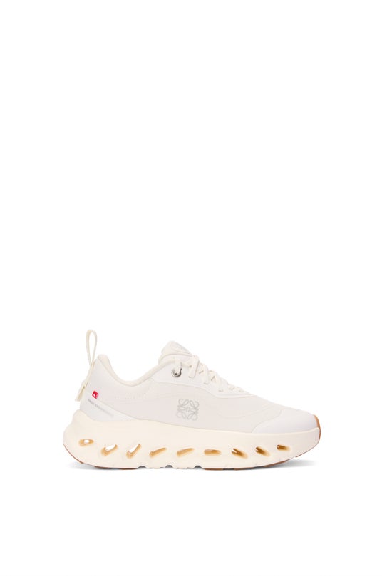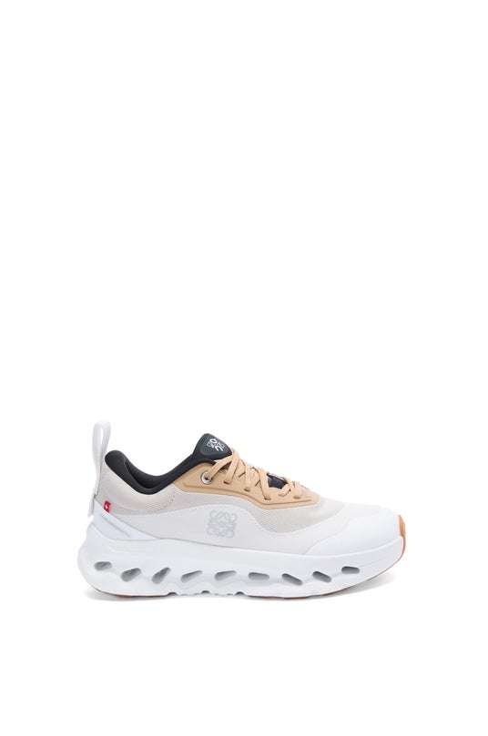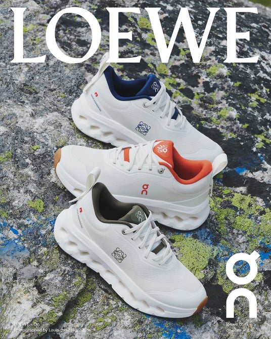 そのほか、アウトソールに新色を採用したタンホワイト/ガムとブラックホワイト/ガムも登場します。サイドにはロエベとOnのロゴがそれぞれ配され、Onの特徴的なレタリングの間にロエベのアナグラムからとった2つの「L」を収めたシルバーのジョイントロゴがタンの部分に施されています。