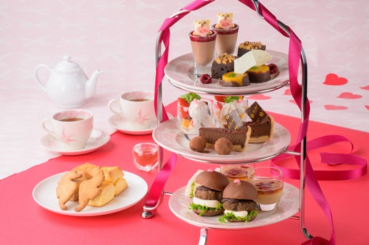 チョコレートソースがかかった三重県産美熊野牛のバーガーをはじめ、赤ワインのトリュフチョコレートやチョコレートムースにブラウニーなど、チョコレートづくしのセイボリーやスイーツをご用意。