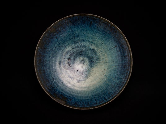 日本の伝統的な志野釉に鉄分を加え、長時間の焼成を5回繰り返すことで鉄分が染み出した、独特のテクスチャーと深みのある黒。青と金色、マットとメタリックの結晶が何層にも重なり織りなす色は、角度によってその輝きを変え、しっとりとした質感もまた魅力のひとつです。フラットな形状のリム皿は、本展にてお披露目する新作となります。