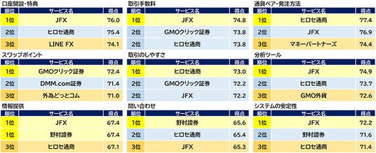 当社は、本調査において、評価項目別ランキングでは全9項目中、「取引手数料」「分析ツール」「システムの安定性」「情報提供」「口座開設・特典」の5項目で1位のほか業態別「FX専門会社」でも1位というご評価をいただきました。