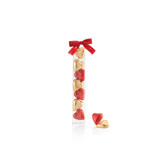 ハート形のミルクとダークのソリッドチョコレートをブリスターに詰めたギフト。日頃の感謝を伝えるさりげないギフトに。