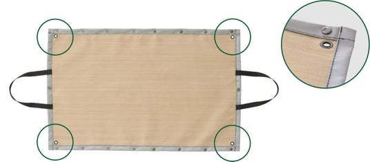バッグとしてたき火台を収納して持ち運び、広げるとたき火の必需品であるたき火台シートとしてそのまま使えます。たき火台シートとして使用する場合、広げると大きく使える96×60cmサイズで、たき火台はもちろん、BBQグリルの下にもセットしてお使いいただけます。耐熱性に優れたファイバーグラスにシリコンコーティングを施しており、火の粉から芝生や大地を保護してくれます。さらに、シートの四隅にはペグを打ち込むことができるペグ穴がありシートをしっかりと固定できます。