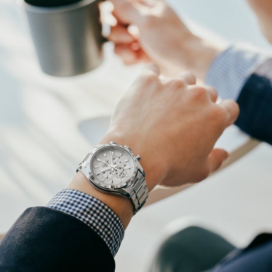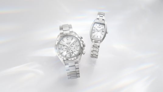 ソーラークロノグラフモデルは、放射状のパターンを施したパール調ダイヤルと、多面カットのインデックス、鏡面仕上げのベゼルが、奥行きのある輝きを実現しています。スーパークリアコーティングを施したサファイアガラスが、ダイヤルの質感を鮮明に伝えます。