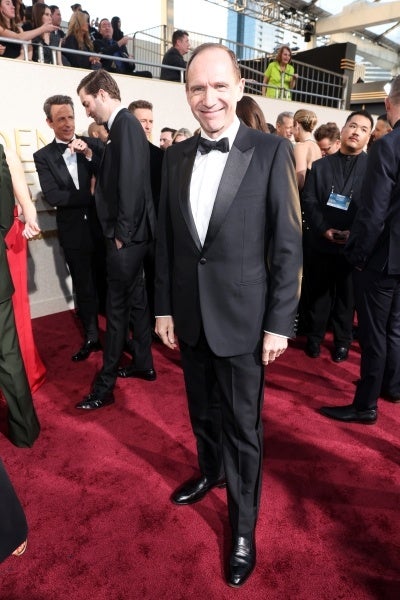 レイフ・ファインズは、ディオール メンズ コレクションからブラックウール&シルクのピークドラペルタキシードを纏い、クラシックなホワイトのコットンシャツを合わせ登壇しました。