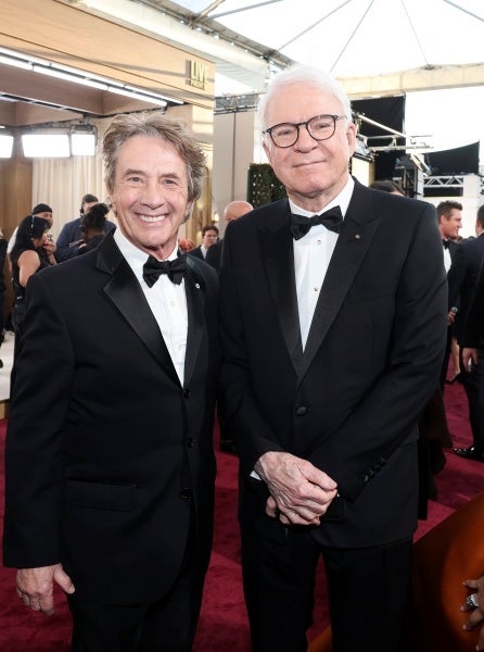 スティーヴ・マーティン(右)は、ディオール メンズ コレクションからブラックのウール&シルクのピークドラペルタキシードを纏い、シルバースナップが付いたホワイトのウエットシャツに、ブラックシルクのボウタイを合わせ、ブラックレザーのパテントダービーシューズを着用しました。