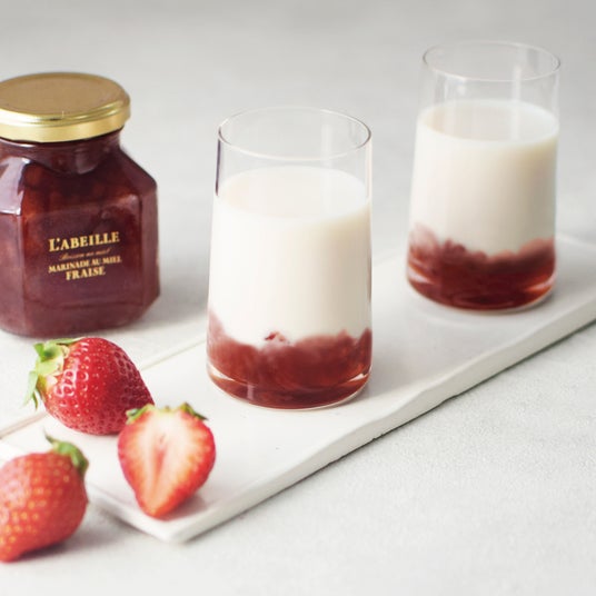 “マリナード”とはフランス語で“漬けたもの”を意味する言葉。ラベイユハニーを贅沢に使って、果実を漬け込んだ「はちみつマリナード」は定番人気シリーズです。今回はたっぷりのアカシアはちみつでいちごを漬け込んだ「はちみつマリナード いちご」を新発売いたします。華やかないちごの香りが広がり、はちみつのやさしい甘さといちごの甘酸っぱさが楽しめます。牛乳や炭酸水で3~5 倍に割ると、はちみつといちごの果肉感が楽しめる“いちごミルク”や“ストロベリースカッシュ”がご自宅で簡単に作ることができます。自分へのご褒美やホワイトデーのギフトにもおすすめです。