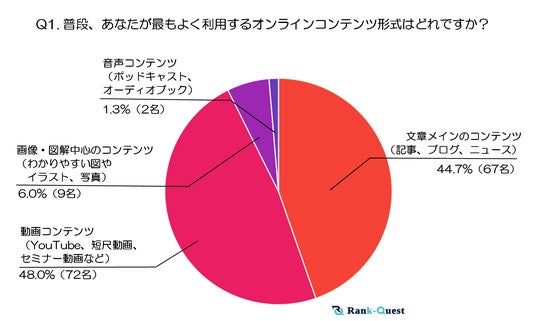 SEO支援で4,300社以上の実績を持つランクエスト(https://rank-quest.jp/column/column/how-to-seo/ )は今回、40代の男女150名を対象にアンケートを実施し、テキスト・動画・音声・画像・図解など、オンライン上で入手できる各種コンテンツがどれほど利用され、どの場面で好まれているのかを分析しました。