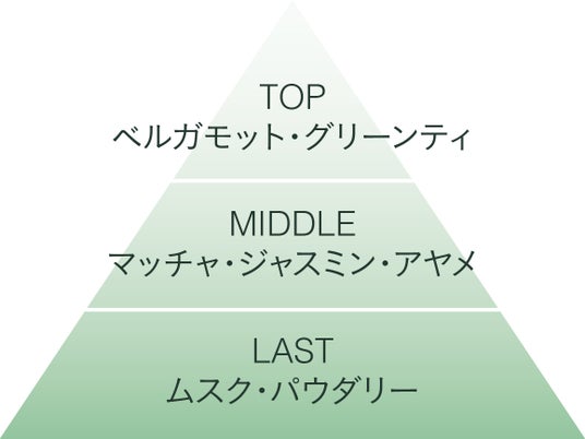 ミドルは、抹茶・ジャスミン・アヤメ。しだいに上品な落ち着きのある香りへ。
