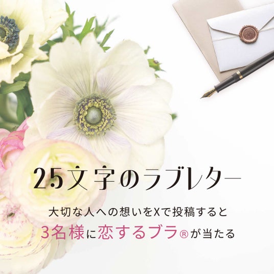 25周年を迎えた恋するブラ。25年間この着けごこちに「恋」をして、支えてくださったお客様への感謝の気持ちを込めて、「25文字のラブレター」をXで募集、優秀作品に選ばれた3名様に、恋するブラの新作(ブラジャーとショーツのセット)をプレゼントいたします。