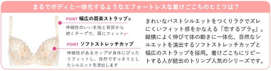 独自のソフトストレッチカップと、幅広のストラップがしなやかに伸縮し、ここちよくバストにフィットする「恋するブラ(R)」。ワイヤーブラとは思えないほどのエフォートレスな着けごこちながら、ナチュラルにきれいなバストをメイクする人気シリーズです。