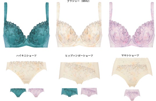 記念すべき年の春夏コレクションは、アネモネをモチーフに、春の女神がまとう花飾りや花柄のドレスをイメージ。カップ上部を飾る花の刺しゅうとプリントチュールが華やかなデザインを、それぞれ印象の異なる3色展開でお届けします。