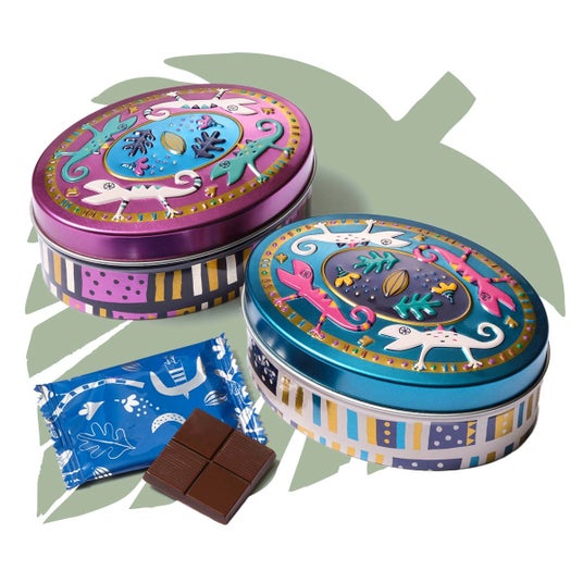 メタリックなカラーがかわいいデザイン缶。カカオ70%のチョコレート入り。