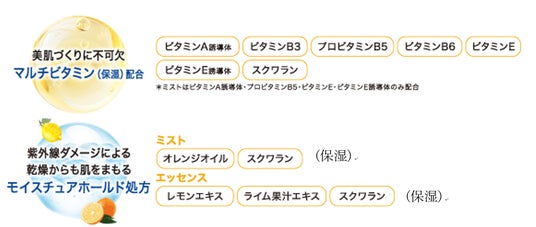 ※1 ビタミンA誘導体(パルミチン酸レチノール)・ビタミンB3(ナイアシンアミド)・プロビタミンB5(パンテノール)・ビタミンB6(ピリドキシンHCL)・ビタミンE(トコフェロール)・ビタミンE誘導体(酢酸トコフェロール)・スクワラン。UVミストVにはビタミンA誘導体・プロビタミンB5・ビタミンE・ビタミンE誘導体のみ配合。