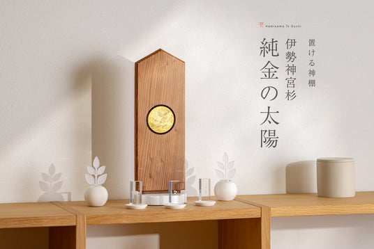 神棚や神具、お供え物など日本の伝統文化を現代の住空間向けにアップデートした商品を展開する「かみさまとおうち」は、フラッグシップ神棚「置ける神棚」シリーズにおいて、伊勢神宮の杉を素材にした新作「置ける神棚 伊勢神宮の杉 純金の太陽」を、お正月限定(2025年1月限定)で発売いたしました。