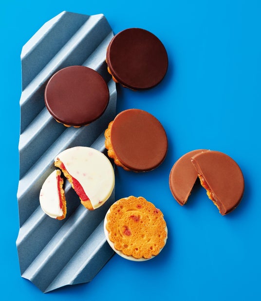 リヨン名物の赤い砂糖菓子とホワイトチョコレートをサクサクのサブレと合わせた3種。“味のマッチングの名手”が奏でるハーモニーをお楽しみください。