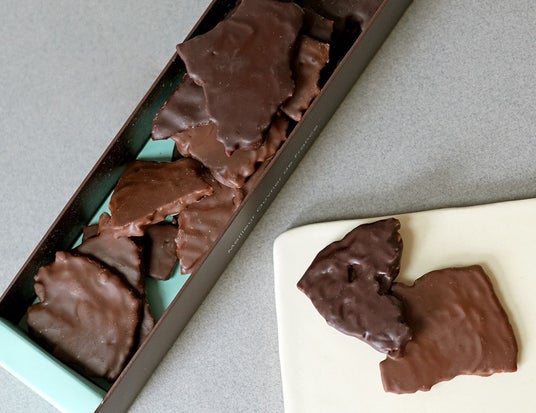薄切りのアーモンドをカリカリに焙煎し、丁寧にキャラメリゼした自家製のキャラメルアーモンドを薄く伸ばして、ダークチョコレートとミルクチョコレートで コーティング。甘さ控えめで、パリパリ食感は、手が止まらない美味しさです。