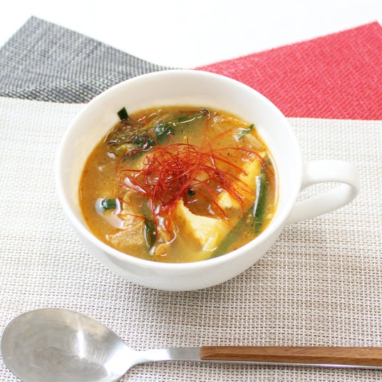 ピリっとした辛さとコク深い旨味の特製スープに、自家製キムチと新鮮な野菜、豚肉がたっぷり入った贅沢な一品です。