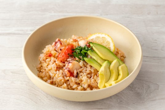– 特長:炊飯器に材料を入れて、スイッチを押すだけの簡単ステップで、バランス良く栄養を摂ることができる一品が完成します。にんにくの香りが食欲をそそり、アボカドの甘味と、レモンやトマトの酸味の相性も抜群で、非常に満足感を感じるメニューです。海産物の生臭さが発芽米のぬかにより気になりません。
