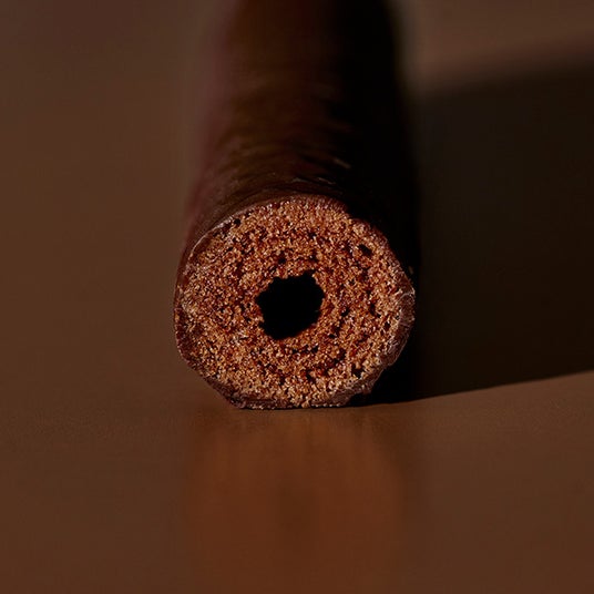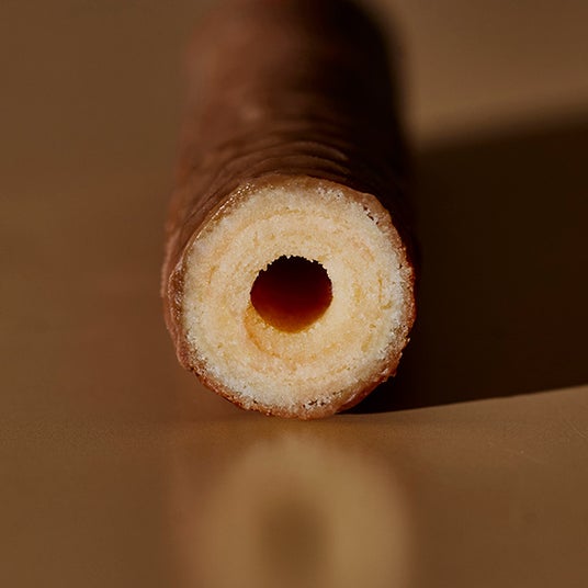 リッチビターバターをふんだんに使用した生地に、カカオ豆本来の風味が楽しめるほろ苦いココアパウダーを混ぜ込んで焼き上げ、ロール状に巻きました。さらに、カカオ生地と相性が良いカカオ分61%の繊細な酸味とほろ苦さを持つビターチョコレートを厳選し、カカオ生地にたっぷりとまとわせました。生地とチョコレートによるダブルのカカオの余韻が重なり合った、濃厚で奥深いビター感ある味わいをご堪能ください。