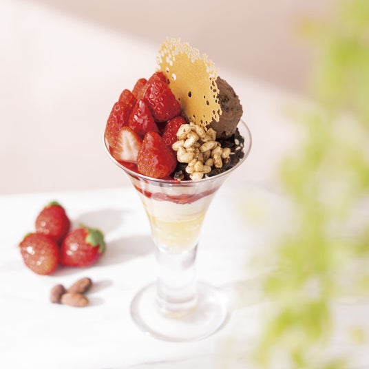 甘酸っぱい旬の苺と濃厚な味わいのゴディバのチョコレートアイス、香ばしいそば茶のプリンなどを合わせ、柚子のジュレですっきりと食べ終えるパフェに仕立てました。食べ進めるにつれて移り行く味わいのグラデーションをお楽しみください。