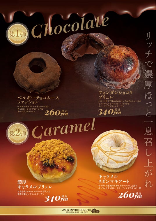 とり専門店『鳥さく』やタニタカフェとのコラボ店『鳥〇食堂×タニタカフェ』などの飲食店を全国に展開するビッグクリエイト株式会社(本社:東京都港区、代表取締役:北浦大作)は、ドーナツ専門店『JACK IN THE DONUTS(ジャックインザドーナツ)』(http://jack-donuts.jp)で、冬の期間限定メニューとして、1月15日(水)より第1弾「ベルギーチョコムースファッション」と「フォンダンショコラブリュレ」を、1月29日(水)より第2弾「濃厚キャラメルブリュレ」と「キャラメルリボンマキアート」を販売いたします。