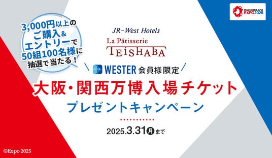 2025年1月9日(木)から3月31日(月)までの期間中、La Patisserie TEISHABA にて1会計3,000円(税込)以上ご購入いただき、店頭の二次元コードからエントリーいただいた、WESTER会員さま50組100名様へ、抽選で2025年大阪・関西万博入場ペアチケットをプレゼントいたします。