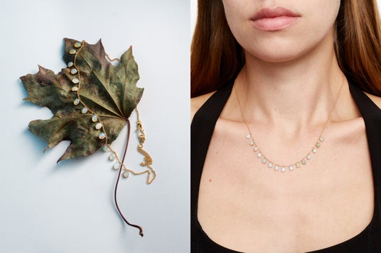 ニュアンスに満ちた色合いと、流れるようなラインが印象的なコレクション。18Kゴールドのネックレスには複数の天然石が留められ、単色のアレンジやマルチカラーのグラデーションがデコルテを美しく彩ります。