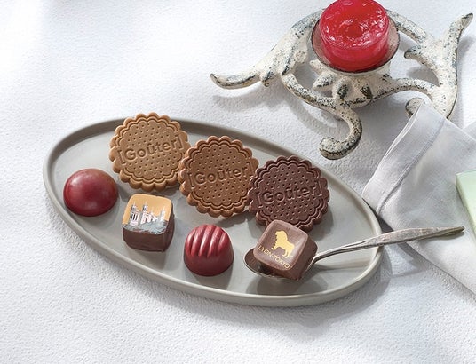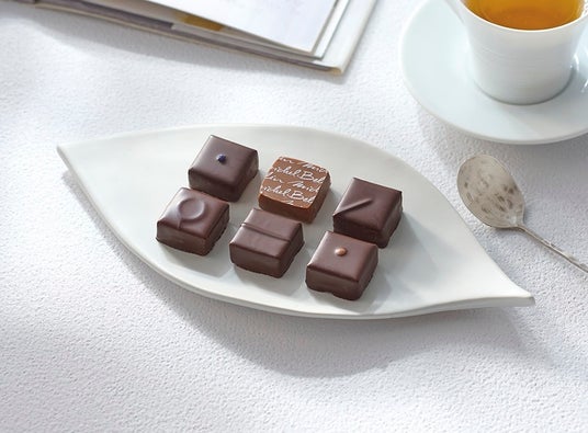 フランス・リヨンを代表するショコラティエ、セバスチャン・ブイエ氏。ビスケットのような形でかわいらしいタブレットショコラとボンボンショコラのセットです。