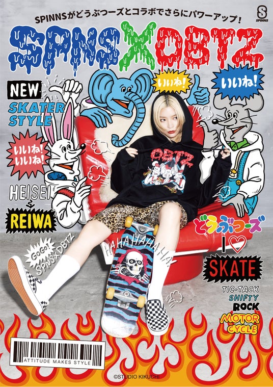 今回は、最近注目される平成ブームに乗せて大人気キャラクター「どうぶつーズ」と原宿ファッションの代名詞「SPINNS」がタッグを組み、青文字スケーター系のエッセンスをたっぷり詰め込んだアイテムをご用意いたしました。