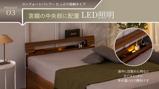 さらに、宮棚には便利なコンセントとLED照明を搭載。スマートフォンやタブレットを枕元で充電できるほか、夜中に目が覚めた際には、やわらかな光が手元を照らし、安心感をもたらします。