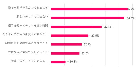 バレンタインの楽しみについて、多くはバレンタイン本来の意味である「贈った相手が喜んでくれること」や「大切な人に気持ちをつたえること」などと回答。そのなかで、Q1で「自分チョコ」を購入予定の人が多数いるという回答につながり、自身の「新しいチョコとの出会い」や「期間限定の会場で過ごすひととき」「会場でのイートイン」などを楽しみにしている人が多い結果となった。会場に行き、多くの体験を求める人が多いという象徴の表れと推測。