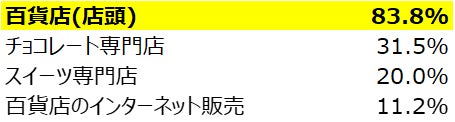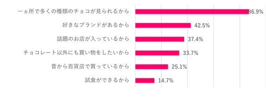 バレンタインチョコを百貨店で購入すると答えた人が約85%で、その理由として「一カ所で多くのチョコが見られるから」と答えた人が約87%、昨年より約15%上昇した。また、昨年上位には入らなかった「試食できるから」と答えた方が約15%おり、実際会場に行き楽しみながらチョコレートを選びたいと思う人が多いことが伺える。