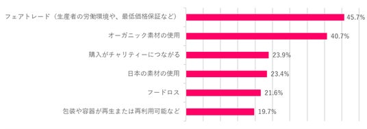 サステナブルに関して約15%の人が「興味がない」と答えたものの、多くの人が何らかの関心があると回答。なかでも昨年に引き続き「フェアトレード」への関心が高い。その他「包装や容器が再生または再利用可能など」と答えた人も上位に。バレンタインのイベントやチョコレートを通して、サステナブルへの関心を高める機会になっていると推測する。