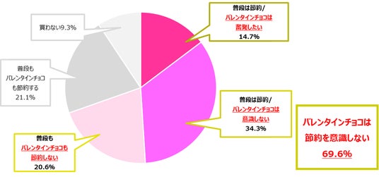 今年も引き続き物価高騰で節約志向の動きがみられる中、昨年バレンタインチョコの値上げを感じた人が約55%いた。ほかバレンタインチョコの節約に関して、全体の約7割はバレンタインチョコでの節約は意識せず、うち、約15%はバレンタインチョコは奮発したいと回答。バレンタインチョコの値上げを感じながらも、普段は節約をしつつ、バレンタインチョコは好きなもの・食べたいものを買いたいという回答が目立った。