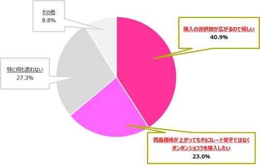 昨今の物価高騰でカカオ自体にも影響がある中、カカオ含有量の割合を抑えたチョコレート菓子が今後増える可能性があることについて、約41%の人が「購入の選択肢が広がるので嬉しい」と回答。また「商品価格が上がってもチョコレート菓子ではなくボンボンショコラを購入したい」という人も23%いることから、やはりチョコレート好きの人は価格が上がっても、カカオを使用した本来のチョコレートを購入されたい人が多いという結果となった。