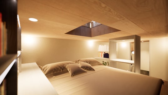 こちらも定員2名の寝床スペース。ホールに面したデスクスペースでは、読書やPC作業を楽しむことができます。日中はワーケーションを、夜は天窓から空を見上げながら天体観測を楽しむなど、贅沢なひとときを提供いたします。