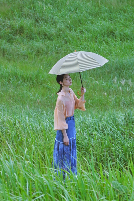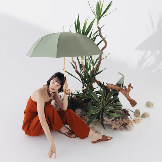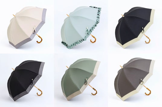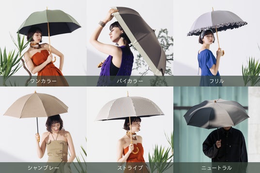 洗練されたトーンの「セージ(フリル)」、バイカラーでは上品なカラーの「オリーブ・オリーブグレー」「ブラック・アイボリー」などが登場。多彩なデザインで日傘がファッションの主役に。