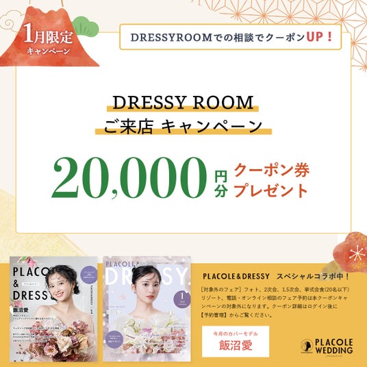 1月限定でDRESSY ROOMご来店にてブライダルフェアのご予約とご成約でクーポン金額+20000円となります!お見逃しなく! ※一部条件あり