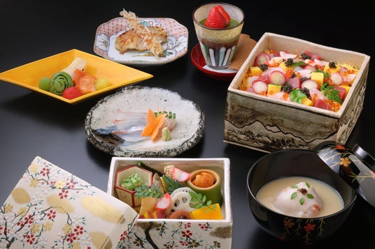 夕刻には、ライトアップされた「花桜テラス」の夕桜の下で、春の旬の食材を味わい尽くす特別夕食を楽しめます。口取りには、筍木の芽和え、雲丹春菜浸し、鯛の子旨煮など、様々な調理法で仕立てた数種類の品を用意します。向付は桜鯛薄造り、椀物は桜海老姫皮真丈、御飯は山菜雛寿司と、目にも鮮やかな総料理長特製の花見膳です。華やかな料理を楽しみながら、宵の空に浮かぶ幻想的な桜に包まれた空間で、ゆったりとした時間を過ごせます。