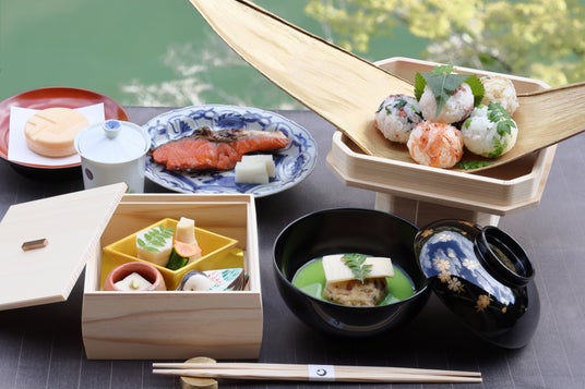 日が昇り、小鳥のさえずりが聞こえる頃、貸し切りの「空中茶室」で、やわらかな朝日に照らされる嵐峡の桜と景色を眺めながら、花見朝食「光琳膳」を味わいます。時代江戸の絵師・尾形(おがた)光琳が嵐山でのお花見の席で金箔の蒔絵を施した光琳笹に春の食材を盛り付けたことにならい、光琳笹を使った華やかな御膳に仕上げました。一献の山桜酢ソーダから始まり、椀物には筍饅頭、光琳笹には桜鯛や桜海老などに、桜葉や桜花を合わせた手毬おにぎりを用意します。手が届くほど近くにあるヤマザクラとともに、優雅な朝の時間を過ごせます。