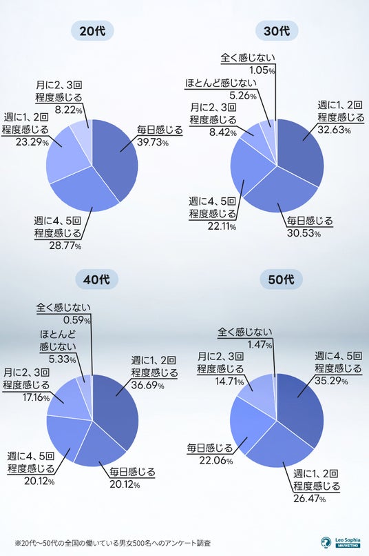 年代別にみると、特に20代は39.73%が「毎日感じる」と回答しており、全体の中で最も高い割合でした。一方で30代になるとその割合は30.53%に減少しますが、依然として高い水準です。