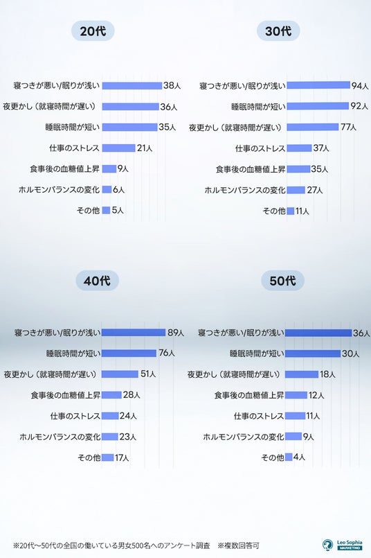 特に注目すべき点は、すべての年代で「寝つきが悪い/眠りが浅い」が最も多い原因として挙げられているところです。この回答は、ストレスや加齢による影響、あるいは睡眠環境の不備が影響していると考えられます。
